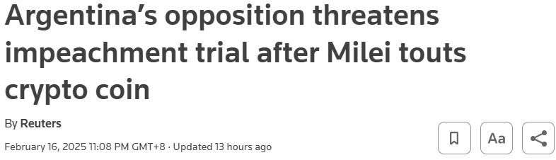 发表时间:2025-02-17 11:52 FX168财经报社(亚太)讯 被称为“阿根廷特朗普”的阿根廷总统米莱(Javier Milei)在周末引发市场行情剧烈崩盘震荡,他先是在社群上宣传LIBRA迷因币,而后火速删除帖文切割关系。阿根廷律师已对他提起诉讼,指控他涉嫌加密货币欺诈。在野党议员表示,准备发动程序弹劾总统。 据The Block报道,阿根廷律师已对米莱提起诉讼,指控其因参与LIBRA代币项目而涉嫌欺诈,这一丑闻在周末爆发后不断升级,当时该代币的价值在Milei最初推广后暴跌95%,尽管随后跌幅收敛,但仍无力挽救崩盘行情。 原告Jonatan Baldiviezo表示:“这个非法团体犯下了欺诈罪,而总统的行为在其中起到了关键作用。” 另一名原告Claudio Lozano是曾担任阿根廷中央银行行长的经济学家;还有一名律师和一名工程师也加入了诉讼。 该案的法官可能最早于周二指定。 米莱否认事先知晓LIBRA代币项目,并坚称自己在丑闻中是无辜的。阿根廷政府周日(2月16日)宣布,将对LIBRA代币项目展开自己的调查,而他的政治反对派则呼吁进行弹劾审判。 他的公告译文称:“鉴于事实,米莱已决定立即让反腐败办公室(OA)介入,以确定包括米莱总统本人在内的国家政府任何成员是否存在不当行为。”该项目顾问Hayden Davis指责米莱撤回对LIBRA项目的支持,导致价格下跌,投资者失去信心。 路透社报道,阿根廷反对党国会议员表示,米莱可能面临国会弹劾审判,阿根廷在野联盟议员Leandro Santoro指出:“这件丑闻让我们在国际上蒙羞,我们必须在国会对总统提出弹劾。”