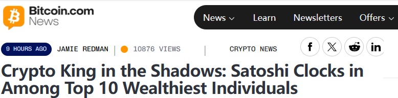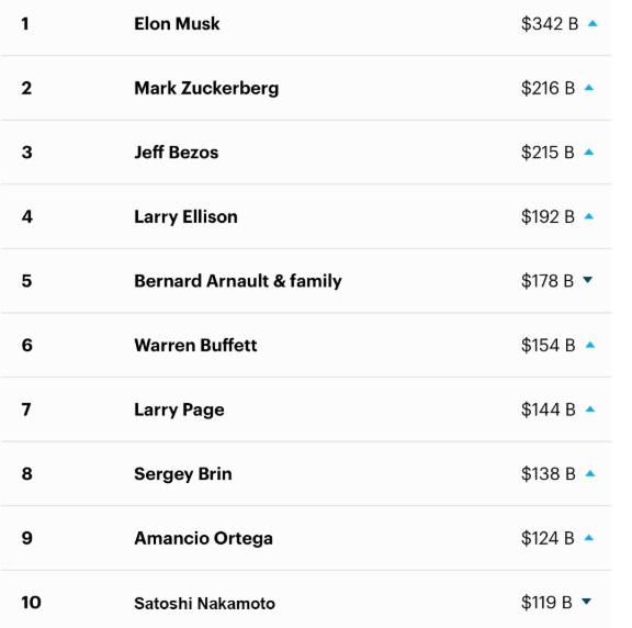 (截图来源:Bitcoin.com) 与此同时,中本聪以1180亿美元的净资产超越前微软(Microsoft)总裁史蒂夫·鲍尔默(Steve Ballmer)。 凭借比特币价格在108,500美元至110,500美元之间徘徊,这位匿名比特币创始人已连续三天位居第十。 如果比特币价格继续攀升,中本聪可能距离榜首只有一步之遥。许多比特币爱好者认为,这一结果不可避免。 要想跻身前五,并超越伯纳德·阿诺特(Bernard Arnault)的1780亿美元的财富,比特币价格需要至少达到每枚162,409美元。要想取代Meta首席执行官马克·扎克伯格(Mark Zuckerberg)排名第二(据福布斯,扎克伯格的身价目前为2160亿美元),比特币价格需达到197,080美元。 但要想超越埃隆·马斯克(Elon Musk),比特币价格还需更高。马斯克的净资产目前估计为3420亿美元。中本聪要达到这个水平,比特币需要超过每枚313,761美元。