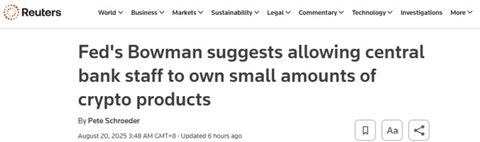 发表时间:2025-08-18 11:05 #NFT与加密货币#FX168财经报社(亚太)讯 英国路透社周三(8月20日)报道称,美联储最高监管官员周二建议,应允许美联储工作人员持有少量加密产品,认为经验将有助于他们更好地开展这些金融市场的监管工作。